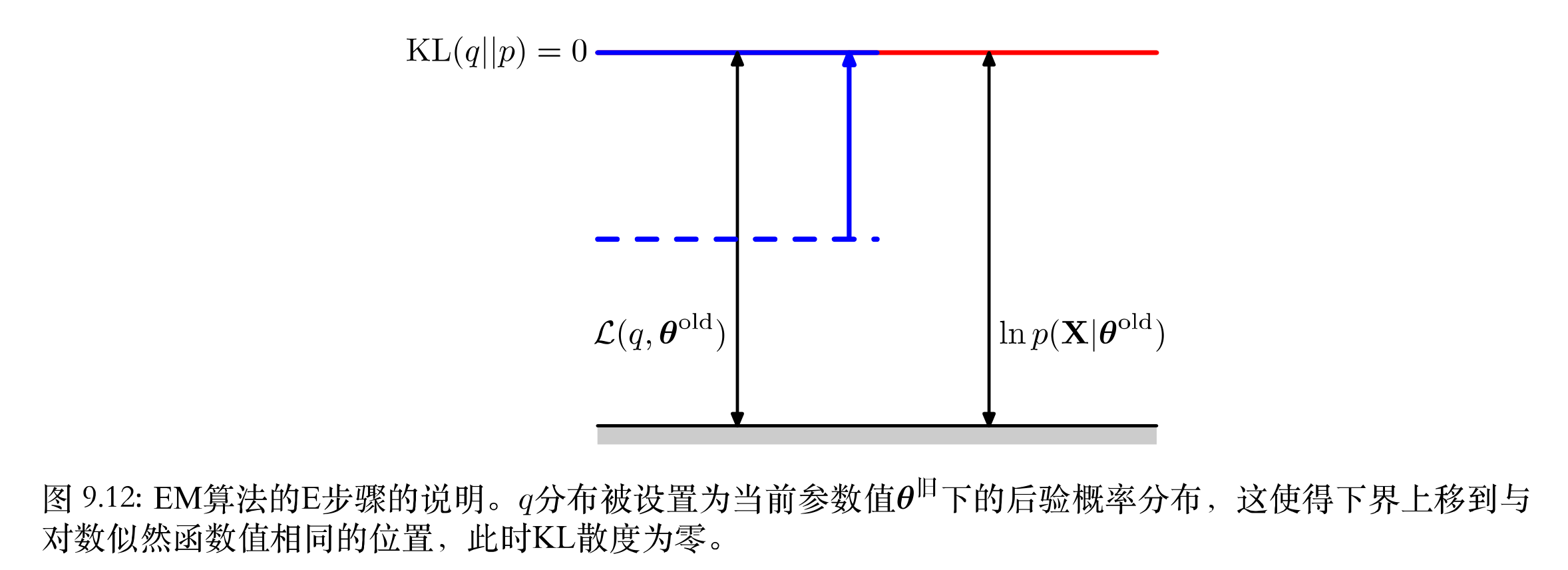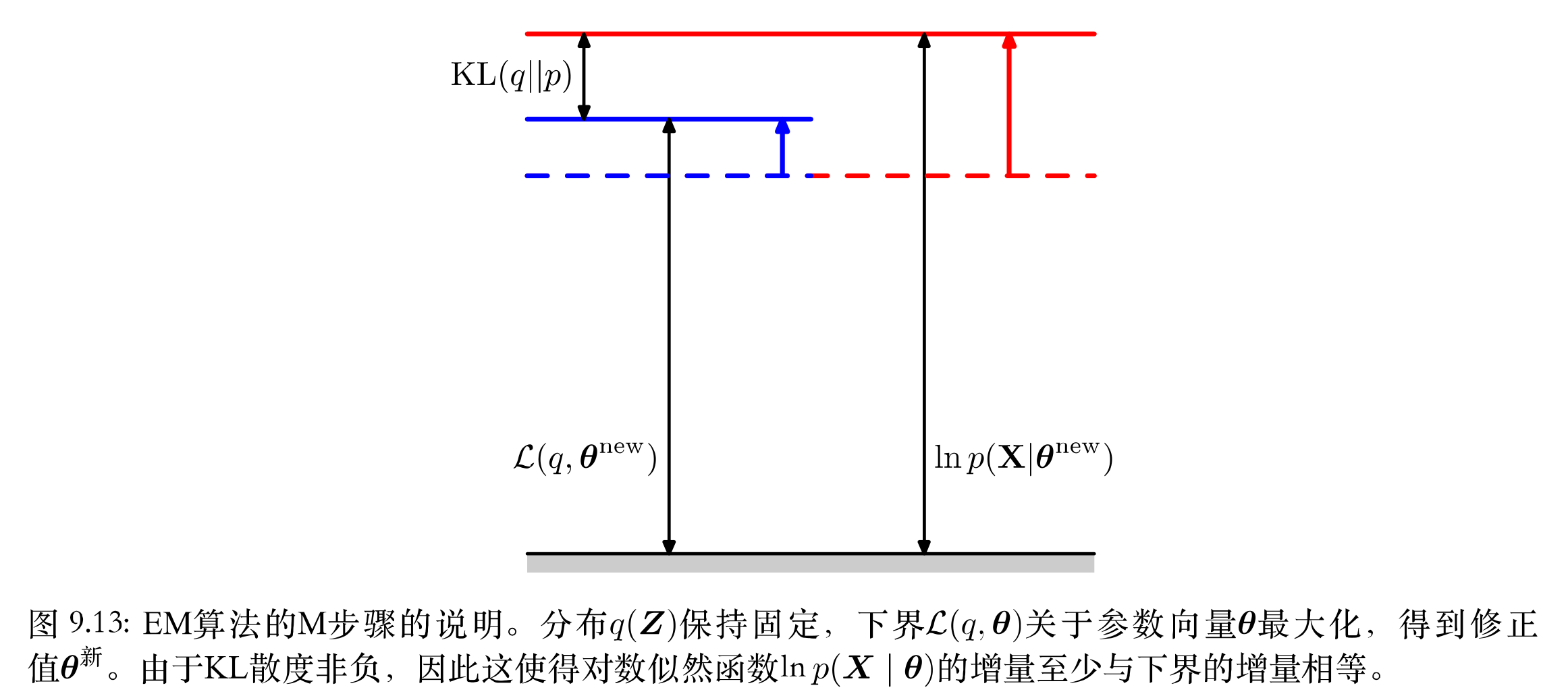 M步骤:保持E步骤中计算得到的$q(Z)=p(Z X, \theta ^{旧})$固定,使下界$\mathcal {L}(q, \theta)$关于$\theta$进行最大化,得到某个新值$\theta ^{新}$。这会使下界$\mathcal{L}$增大(除非达到了极大值),这会使得对应的对数似然函数$ln \ p (X \theta^{新})$增大。原因是当前潜在变量的分布$q(Z)$由旧的参数值确定并且保持了固定,因此它不会等于新的后验概率分布$p(Z X, \theta ^{新})$,从而KL散度不为0。于是对数似然函数的增加量大于下界的增加量(下界增加量+新的KL散度值)。